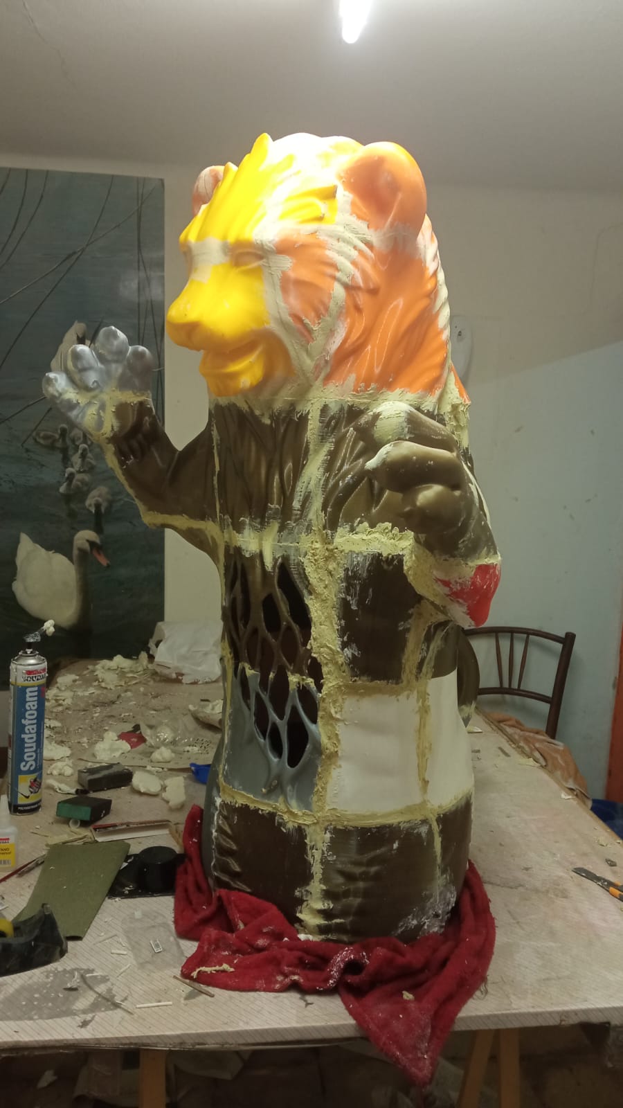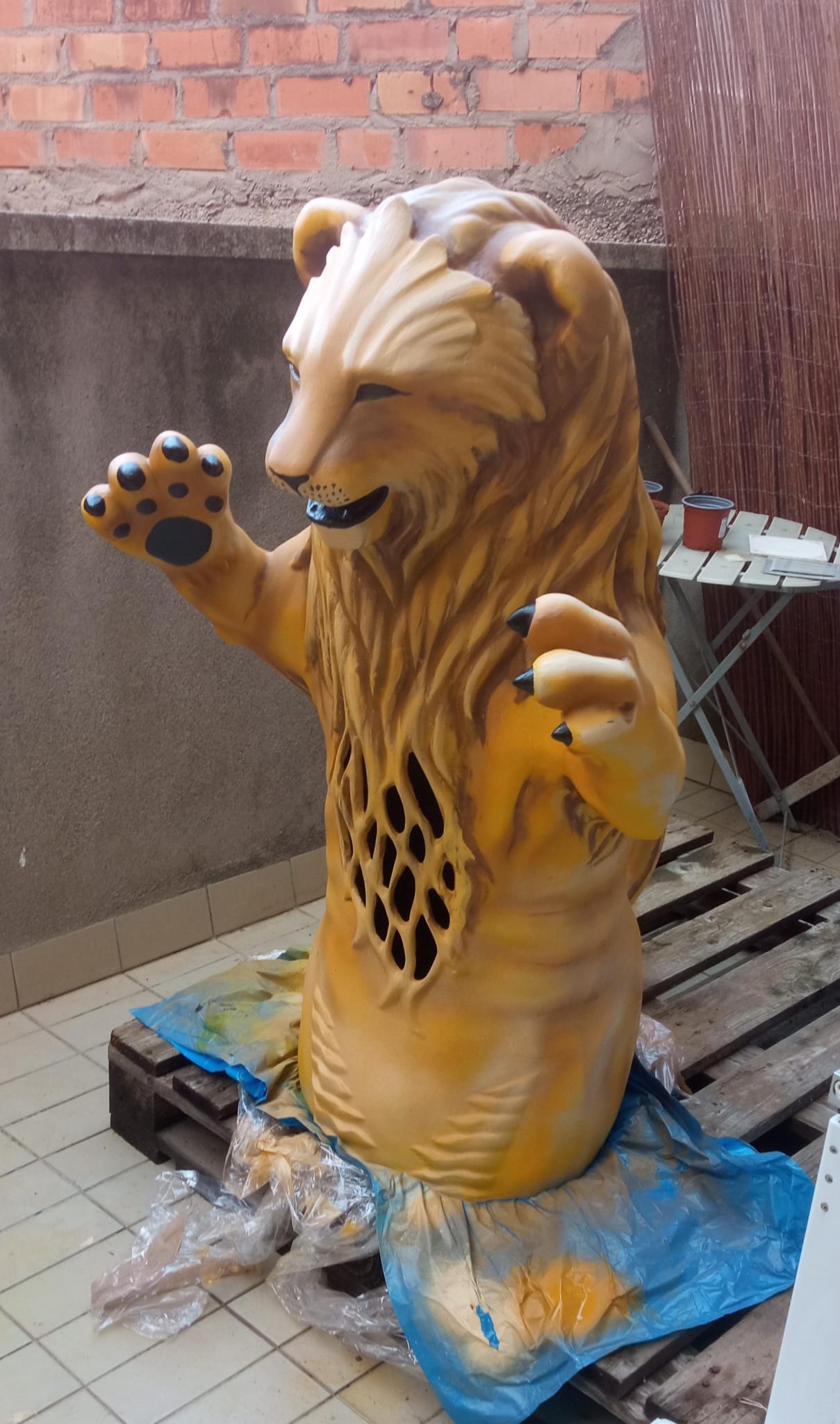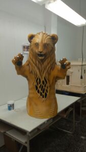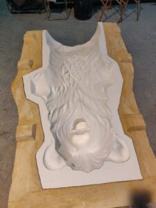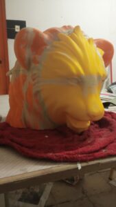 Un cop es va tenir aprovat el model digital (consulta el model digital aquí), es va procedir a imprimir tota la figura per peces. Quan es fan impressions 3D és cert que les peces de plàstic no tenen la qualitat suficient perquè la figura pugui tenir vida pròpia com a imatgeria festiva. Principalment pels acabats de les juntes de les peces i perquè és difícil aplicar pintura als plàstics i polímers que hi ha ara mateix al mercat. Per això, un cop impresa i muntada la peça amb plàstic, l’artesà Miquel Adell (@adelltallerresines) en va fer un motlle positiu de guix, un negatiu en silicona i un cop acabat el motlle sobre la peça de plàstic, va fer la peça en positiu amb fibra de vidre.