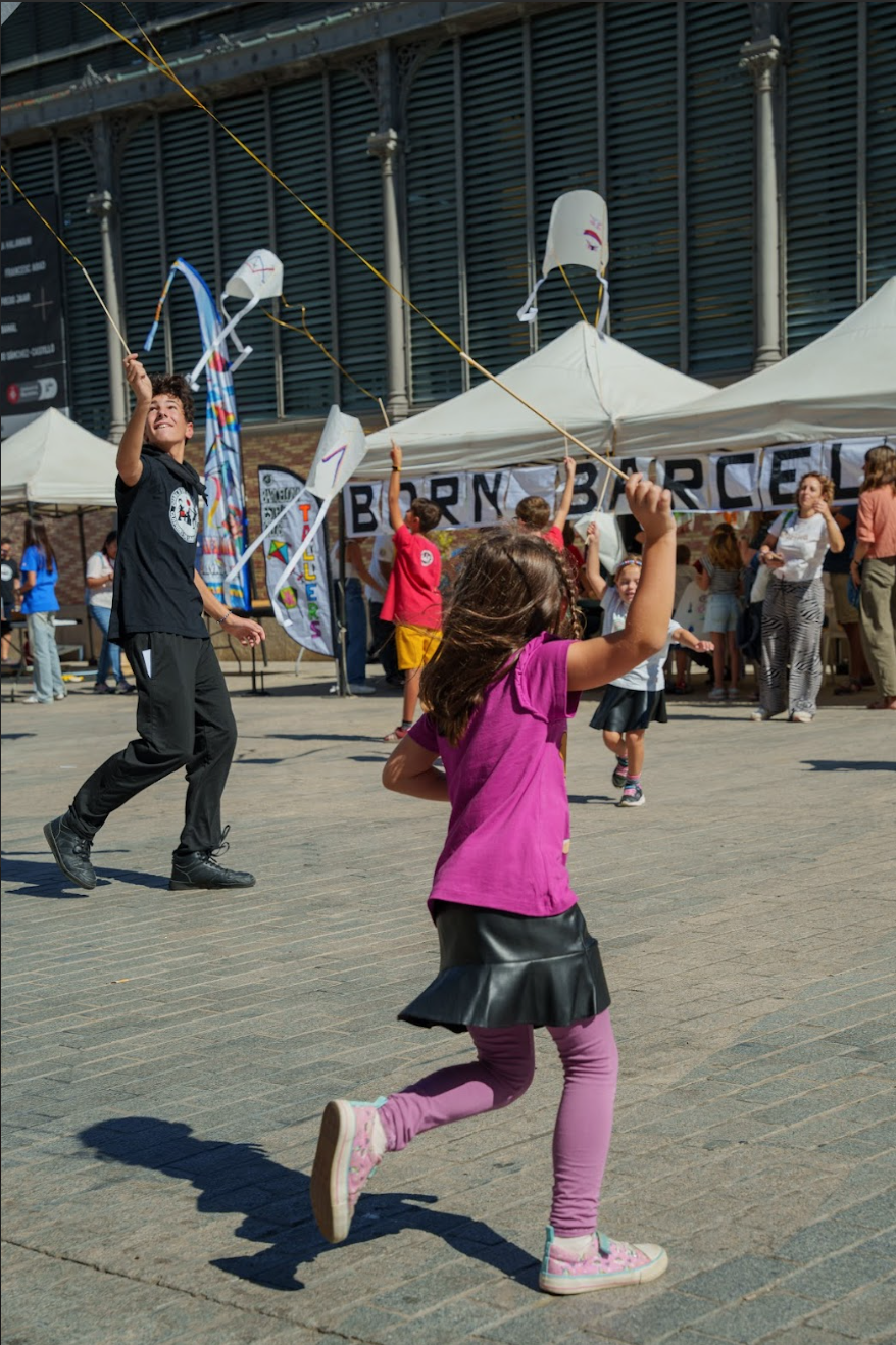 Infants jugant amb els estels fets al taller d’estels a la plaça Comercial