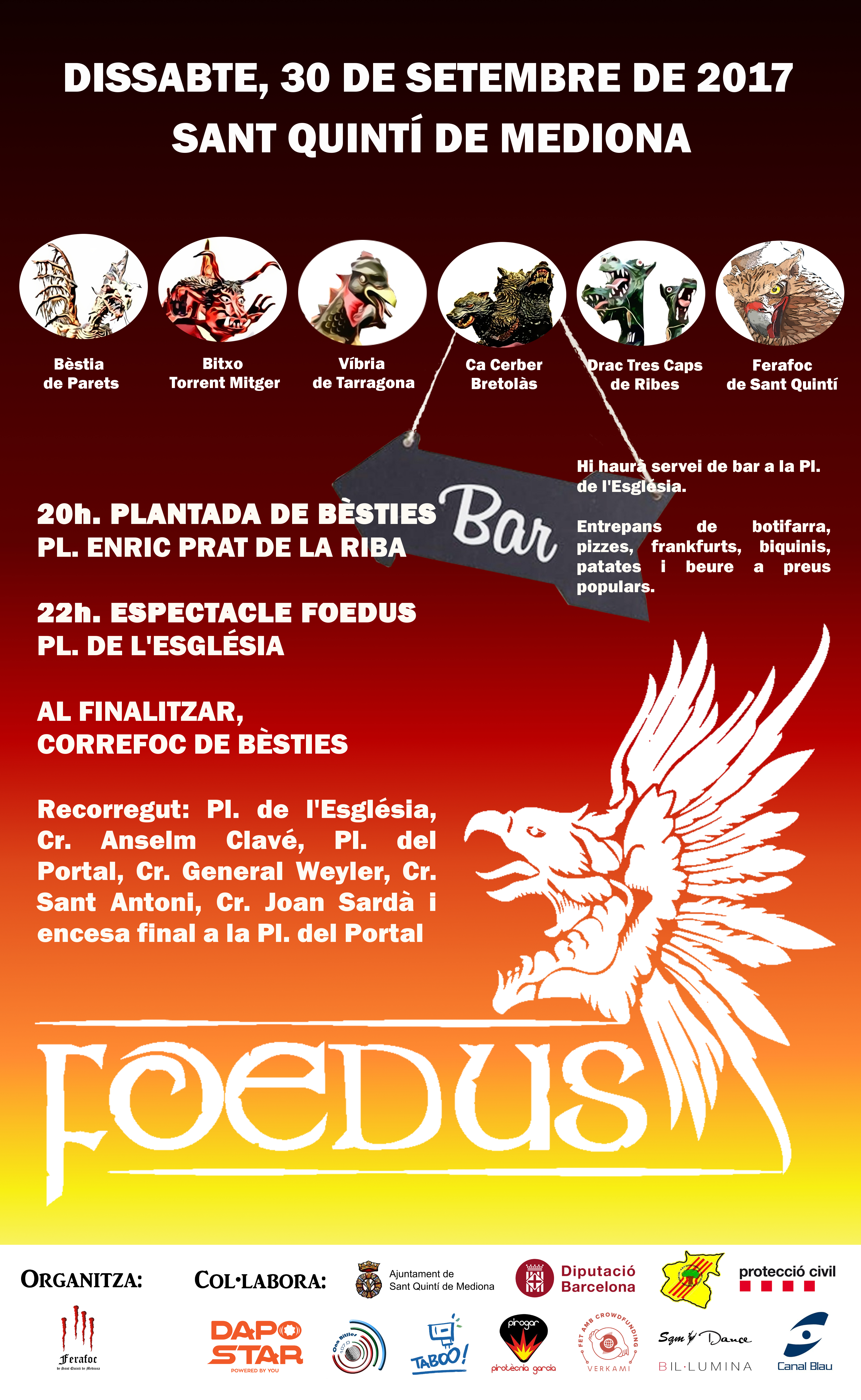 l’espectacle Foedus El proper dissabte 30 de setembre, es dura a terme a Sant Quintí de Mediona la segona edició de l’espectacle Foedus, escrit per l’historiador Joan Serra Arman. Un espectacle que es va estrenar l’any passat per a commemorar el cinquè aniversari de la bèstia quintinenca i que representa la lluita entre el bé i el mal. El mal encarnat en la figura de Ventus, un esser malèfic en forma de vent que vol fer desaparèixer del món el folklore i el bé que ho escenifica el Ferafoc, que és l’encarnació del comte Guillem. Foedus combina diferents disciplines com el teatre, la dansa, la llum, el foc i la música. Com a novetat important d’aquest any, l’espectacle serà apadrinat per la Carme Ruscalleda Serra, la cuinera catalana amb més estrelles michelin Aquesta edició, la Bèstia de Parets, el Bitxo Torrent Mitger de Terrassa, la Víbria Serrallenca de Tarragona, el Ca Cerber Bretolàs de Barcelona i el Drac tres caps de Sant Pere de Ribes, seran les bèsties supervivents que juraran fidelitat al Ferafoc de Sant Quintí de Mediona per a lluitar contra Ventus i els Halifax, les àligues pavoroses que serveixen a Ventus. La cita serà a les vuit de la tarda a la plaça Enric prat de la Riba, on es realitzarà la plantada de bèsties i a les deu de la nit començarà l’espectacle FOEDUS a la plaça de l’Església. Tot seguit, començarà un correfoc pels principals carrers del poble. Recorregut: Plaça de l’Església, C/ Anselm Clavé, Plaça del Portal, C/ General Weyler, C/ Sant Antoni, C/ Joan Sardà i final a la Plaça del Portal