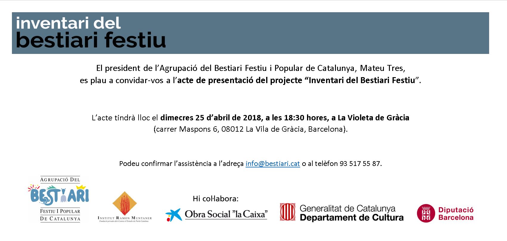 El proper dimecres 25 d’abril de 2018, a les 18:30h, tindrà lloc la presentació del projecte “Inventari del Bestiari Festiu”, al Centre Cultural La Violeta de Gràcia (Carrer Maspons 6, 08012 La Vila de Gràcia, Barcelona). Es prega confirmar assistència. En acabar l’acte, es servirà un petit refrigeri per als assistents.