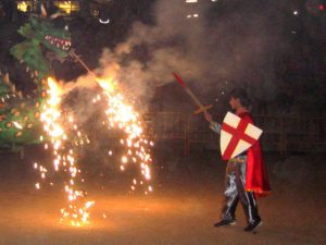 Però, reprenent el nostre protagonista mort pel Sant Jordi de la llegenda, tornem al drac i el seu paper. Dins la tradició popular catalana el drac simbolitza l’infern i el mal, és el servent del diable i flagell de pecadors. Recordem que sorgeix dels entremesos medievals i és una figura que pretén infondre por i respecte al poble creient. També és cert que les forces del mal atreuen molt i el drac és l’element festiu més repetit dins del bestiari.