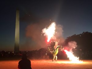 Però encara quedaba una sorpresa pels americans, veure en acció i amb foc a les figures de bestiari, això per temes de seguretat i que el lloc on èrem està considerat parc natural, només ho vam poder realizar un dia en tot el Folklife. Això va crear molta expectació i tothom s’interessava per quin dia seria però no va ser fins el penúltim dia que es va poder cremar.