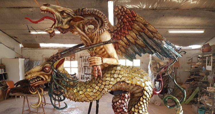 Sant Antoni de Vilamajor és a la falda del Montseny, una muntanya plena de llegendes i tradicions que parlen de bruixes, dimonis, dones d’aigua i altres éssers fantàstics. La bèstia dissenyada per Dolors Sans lliga amb aquestes llegendes de bruixes: és un boc fantàstic i agressiu que es transforma una part en cabra, que porta ales, i una altra part en serp.