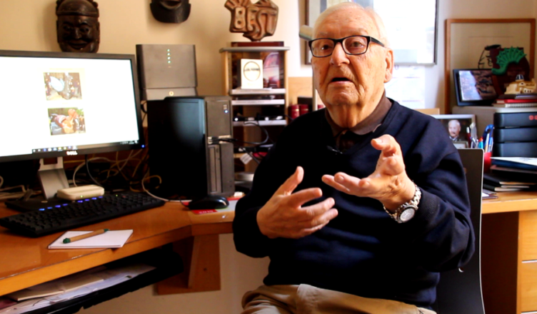 (Foto: Ramon Saumell parlant des del seu despatx sobre els seus orígens com a fotògraf de bestiari / Autor: Meritxell Bayarri)