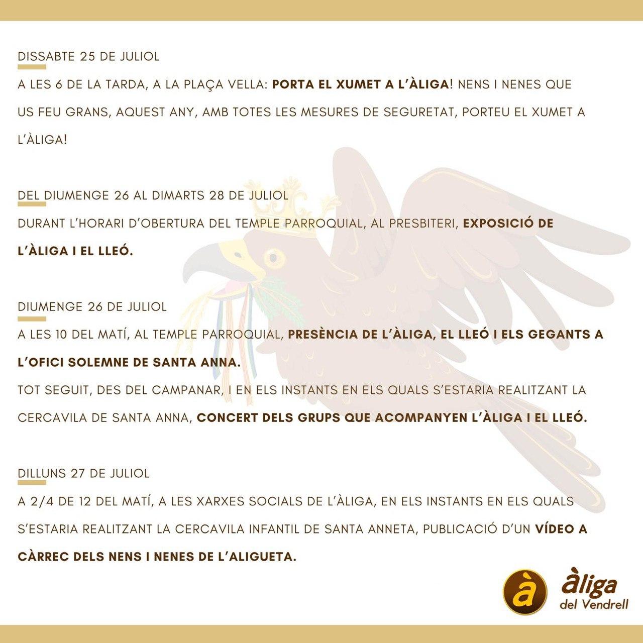 Aquesta Festa Major de Santa Anna al Vendrell serà diferent per diferents motius. No es podran fer cercaviles ni actes multitudinaris a causa de la pandèmia del coronavirus. Així i tot el 26 i el 27 de juliol es faran una sèrie d’actes simbòlics a la vila. Recentment, per animar encara més la festa, l’Àliga del Vendrell ha preparat un programa amb vuit activitats pensades per a tots els públics.