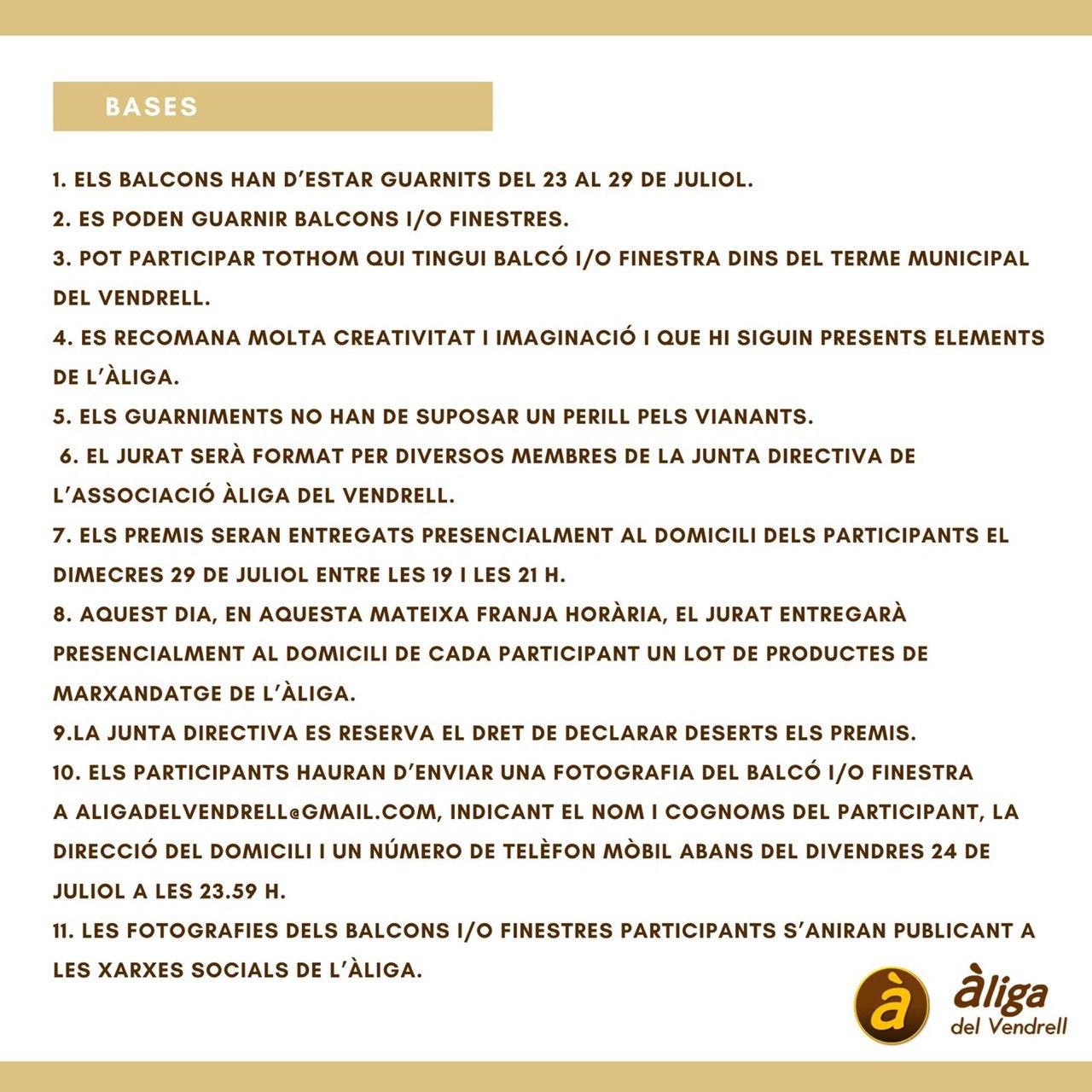 Del dijous 23 al dimecres 29 de juliol tindrà lloc el Concurs de Balcons amb Motius Aliguers. Com bé diu el seu nom, es tracta d’una proposta que anima els vendrellencs i vendrellenques a guarnir els seus balcons amb decoracions inspirades en l’Àliga del Vendrell. L’objectiu de l’activitat és que “malgrat tot, la Festa Major llueixi com mai”, diu el programa. La millor decoració serà premiada amb un sopar per a dues persones al restaurant l’Enxaneta (podeu consultar les bases en el següent enllaç).