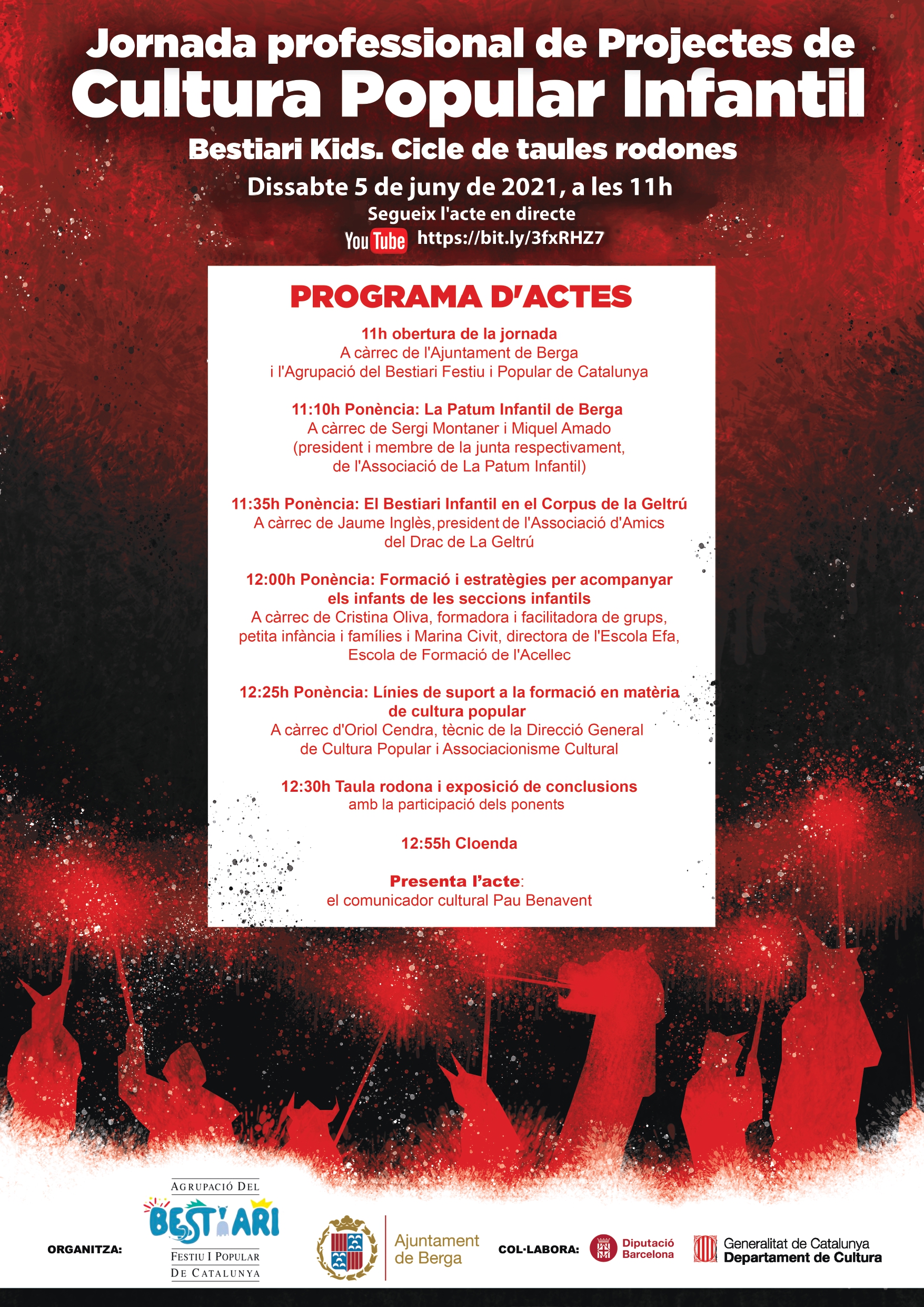 A les 11 del matí, a través del canal de Youtube de l’Agrupació del Bestiari, es podrà seguir en obert un cicle de xerrades en el qual es parlarà de temes com la legislació, la seguretat, les actituds pedagògiques i la dinamització de les colles de cultura popular amb nens i joves. Es presentaran exemples, com el cas de la Patum infantil de Berga i el Corpus del barri de la Geltrú de Vilanova, i es farà una taula rodona per a debatre i resoldre dubtes.