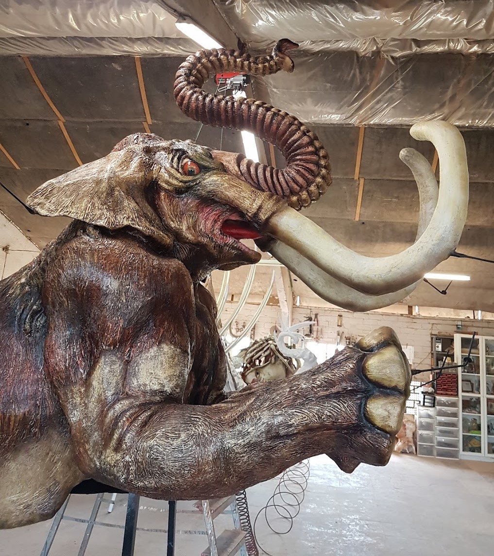 El procés de construcció comença amb una escultura en fang a mida real del Mamut. Sobre l’escultura de fang es col·loca la fibra de vidre. Un cop la fibra és consistent, es separa de l’escultura de fang  i ja  queda la peça construïda. Posteriorment es pinta, es col·loquen les potes i l’estructura pels portadors i els punts de foc.