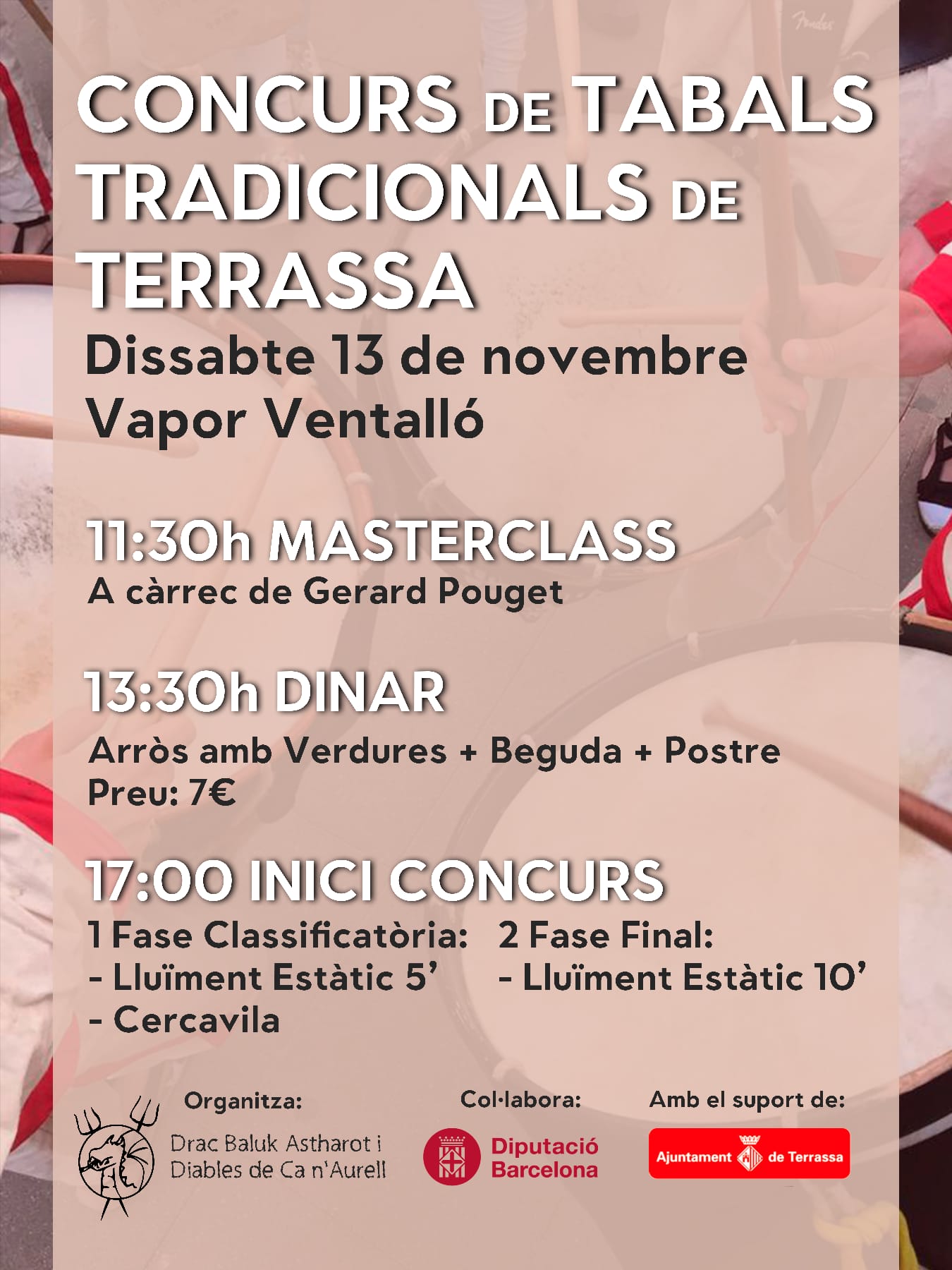 El Drac Baluk Astharot de Terrassa organitza per primer cop un concurs de Tabals Tradicionals a la ciutat. Compta amb la col·laboració de la Diputació de Barcelona i el suport de l’Ajuntament de Terrassa.