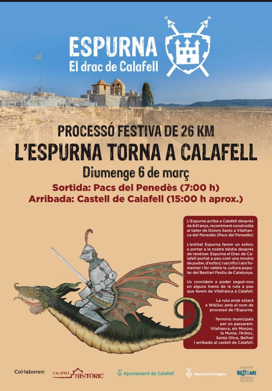 Amb el Drac Espurna el municipi de Calafell tornarà a tenir una bèstia festiva. L’anterior, amb tres caps, va desaparèixer el segle passat. Ja fa tres anys que s’està treballant en aquest projecte, la figura del qual està composta per un cavaller amb armadura que cavalca un drac. Representa ni més ni menys que el personatge històric de Guerau de Palou, el senyor feudal del Castell de Calafell.