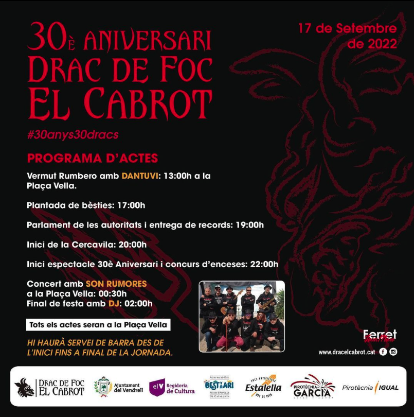 L’espectacle del 30 aniversari es tancarà amb una encesa conjunta de les maces del Cabrot i el Cabrot i, en acabar, es llançarà un castell de focs des del campanar del Vendrell. A continuació, s’oferirà un concert amb el conjunt musical Son Rumores i el final de festa serà amb un DJ.