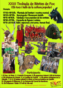 Al voltant de 200 persones participaran directament en l’acte, entre portadors, intendència i músics. Els actes s‘iniciaran a les 17 h amb la plantada de les figures de les entitats participants a la Plaça Major, i amb actuacions musicals de les entitats. A les 18 h tindrà lloc la presentació i lliurament de records. A les 18.15 h Tocs de Cultura Popular. A les 18.30 h cercavila pels carrers Vera, Pasqual Tirado, Enmig, Antonio Maura, Cavallers, Plaça de l’Herba i tornada a la Plaça Major. A les 19.30 h els balls i les enceses per a tancar a les 20 h amb un remat pirotècnic.