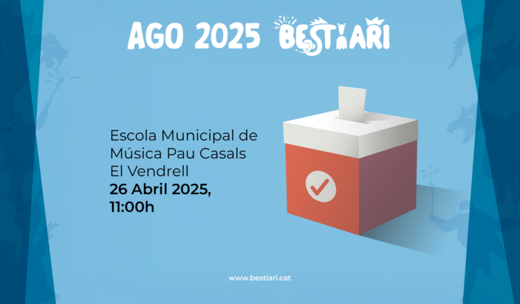 El proper dissabte 26 d’abril a les 11:00h en primera convocatòria, el municipi del Vendrell acollirà l’AGO de Bestiari, que es celebrarà a l’Auditori Petit de l’Escola Municipal de Música Pau Casals, a la sala Agustí Cohí i Grau.