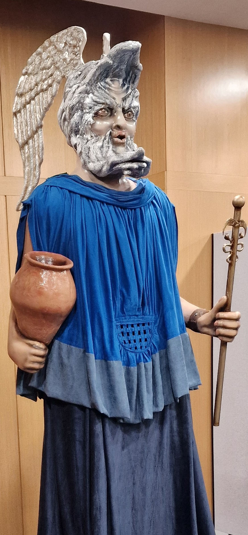 El gegantó Aire, s’inspira en la mitologia grega, concretament del déu Èol, senyor dels vents. Porta unes ales al cap, símbol característic del déu i representació directa de l’element aeri. La seva barba i els cabells es mostren en moviment, com si els arrossegués el vent, reforçant així la seva identitat simbòlica. La seva expressió facial, amb les galtes inflades – com es representa el déu – i la boca bufant, evoca la força invisible però poderosa de l’aire. A una mà sosté un bastó amb el qual controlava les tempestes i els vents del món, mentre que amb l’altra porta una àmfora, el recipient on, segons la llegenda, Èol guardava els vents.