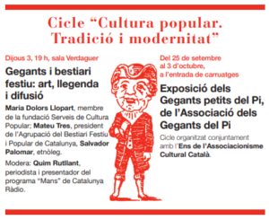 Trobar Esdeveniments Navegació de les vistes d'esdeveniments Veure com Llista Mes Dia Dia de Buscar Esdeveniments for 3 d'octubre de 2019 Navegació per dia « Previous Day Next Day » Tot el dia Exposició Botafocs: “Façanes, peixeres i un conte” … i altres objectes d’aniversari del nostre bestiari 3 d'octubre de 2019 a 30 d'octubre de 2019 Museu d’Etnologia de Castelló, Carrer Cavallers, 25 Castelló de la Plana, Espanya Per saber-ne més » 19:00 Taula Rodona: Gegants i bestiari festiu: art, llegenda i difusió 3 d'octubre de 2019 19:00 a 21:00 Ateneu Barcelonès, Carrer de la Canuda, 6 Barcelona, Espanya Des de principis d'any, el cicle 'Cultura popular: tradició i modernitat' està debatent sobre el present i futur de les expressions festives catalanes. Per saber-ne més » + Export Events