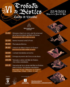 VI Trobada de Bèsties del Ball de Diables de Caldes. Una jornada amb barra oberta durant tot el dia, i activitats per a totes les edats: - 11h Obertura de la barra i Inici de la Gimcana Infantil (en motiu del Xè aniversari de la Secció Infantil del Ball de Diables) - 12-14h Vermut musical amb DJ Putxi - 16h Plantada de bèsties - 16:30-18:30h Concurs de dibuix infantil (4-12 anys) - 19h Lluïments de les bèsties, sense foc -…
