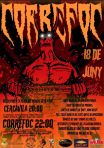 Programa d'actes: De 18 h a 19 h: Taller piro a la plaça del Mercat A les 20 h: Cercavila A les 22 h: Correfoc Colles participants: Drac Braulio Dragona Espurna Dragona Entxuscat de Molins de Rei Colla de Diables de Sant Joan Despí Associació Colla de Diables del Casc Antic de Barcelona Diables de Sant Cugat del Vallès Bestialots Espurnats de la Sagrada Família Diables Rojos de Sant Feliu de Llobregat Dimonis de Molints de Rei