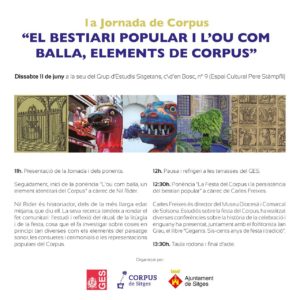 Aquest dissabte 11 de juny, a la seu del Grup d'Estudis Sitgetans (GES) se celebrarà 1a Jornada de Corpus: "El bestiari popular i l'ou com balla, elements de Corpus", coorganitzada pel Grup d’Estudis Sitgetans i la Comissió del Corpus de Sitges. Tal com explica el president de la Comissió del Corpus, Eduard Tomàs, “ja fa anys que, amb col·laboració amb el GES, fem una xerrada històrica o un col·loqui per Corpus”. Enguany, a proposta del GES, continuant amb la tasca conjunta de…
