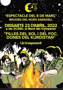 Dissabte 23 d'abril, a les 21 h, podreu anar a veure l'espectacle que la colla de les Bruixes del Nord de Sabadell havia preparat pel 8 de març. Es diu "Filles del Sol i del Foc, Dones del Kurdistan" i es farà al Racó del Campanar.