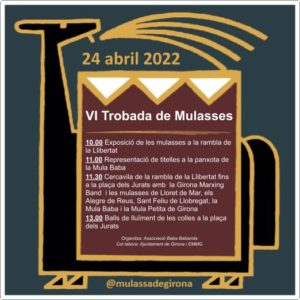 El pròxim diumenge 24 d'abril tindrà lloc la VI Trobada de Mulasses de Girona. Des de les 10 del matí fins a les 14 h es faran diferents activitats com: 10 h: Exposició de mulasses a la Rambla de la Llibertat. 11 h: Representació de titelles a la panxota de la Mula Baba. 11.30 h: Cercavila de les mulasses. Recorregut: Sortida des de la rambla de la Llibertat fins a la plaça dels Jurats amb la Girona Marxing Band. 13…