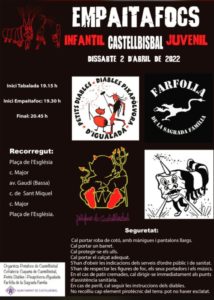 Dissabte 2 d'abril la Cuqueta de Castellbisbal serà la protagonista de l'Empaitafocs infantil-juvenil. L'acte començarà amb una tabalada a les 19.15 h i després, serà el torn del correfoc, que sortirà a les 19.30 h des de la plaça de l'Església. Caldrà anar ben protegit i portar roba de cotó, amb mànigues i pantalons llargs. Altres de les colles participants a l'acte seran: els Petits Diables i els Diables Pixapólvora d'Igualada, l'Associació Farfolla de la Sagrada Família i els Potafocs…