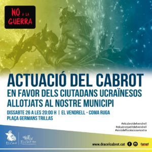 Dissabte 26 de març, a les 20 h, El Cabrot del Vendrell, el Cabrot Petit, les maces i la batucada faran una actuació a Coma Ruga per donar tot l'escalf possible als ciutadans ucraïnesos que estan allotjats al municipi. Ara més que mai, cal estar units en el "NO a la Guerra"! Autor del cartell: Joan Marc Ferret.