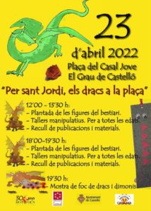 El pròxim dissabte 23 d'abril, l'associació Botafocs Ball de Dimonis i Bestiari de Castelló celebrarà la Diada de Sant Jordi al barri del Grau. Durant tot el dia es faran diferents activitats a la plaça del Casal Jove. Aquestes són: De 12 a 13.30 h: Plantada de figures de bestiari Tallers manipulatius per a totes les edats Recull de publicacions i materials De 18 a 19.30 h: Plantada de figures de bestiari Tallers manipulatius per a totes les edats Recull…