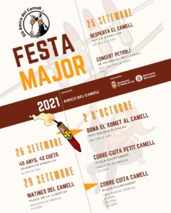 Dissabte 25 de setembre, els més menuts tenen una cita amb el Camell de Molins de Rei. Caldrà la seva ajuda per despertar aquesta enorme bèstia festiva. Els actes estan dirigits als més petits de casa, amb jocs i activitats de temàtica camellaire. No cal inscripció prèvia. L’accés al recinte serà amb control d’aforament i el preu de l’entrada per infant menor de 12 anys serà de 2 €.