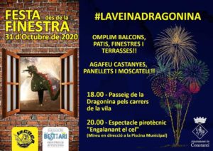 El pròxim dissabte 31 d'octubre l'Associació Amics Colla C.O.C.A. de Constantí organitzarà la festa "#laveinadragonina2020". L'acte es podrà gaudir des de les finestres, terrasses i balcons dels habitatges del municipi. A les 18 h la Dragonina es passejarà pels carrers del poble i, a les 20 h, es farà l'espectacle pirotècnic "Engalanant el cel", que es podrà contemplar des de casa mirant en direcció a la Piscina Municipal.