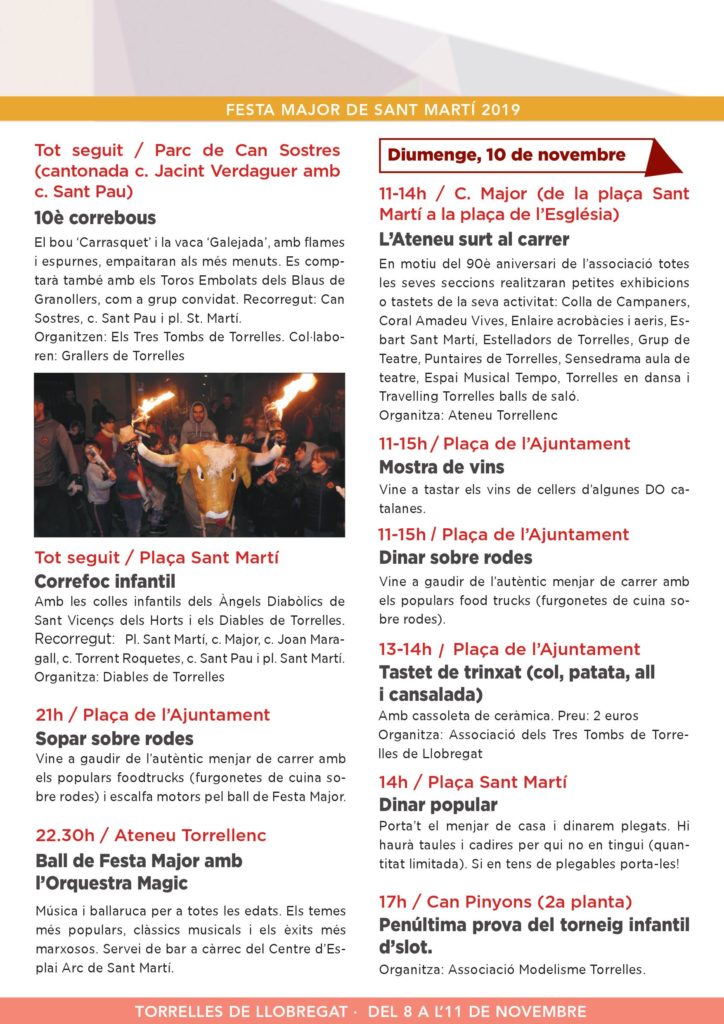 Per celebrar la Festa Major de Sant Martí, dissabte 9 de novembre Torrelles de Llobregat ha organitzat una tarda plena d’activitats. A partir de les 17 hores, des de la plaça de Sant Martí començarà una sessió d’animació infantil amb xocolatada. A continuació serà el torn del 10è Correbous. Un any més el bou Carrasquet i la vaca Galejada empaitaran els més menuts amb flames i espurnes.