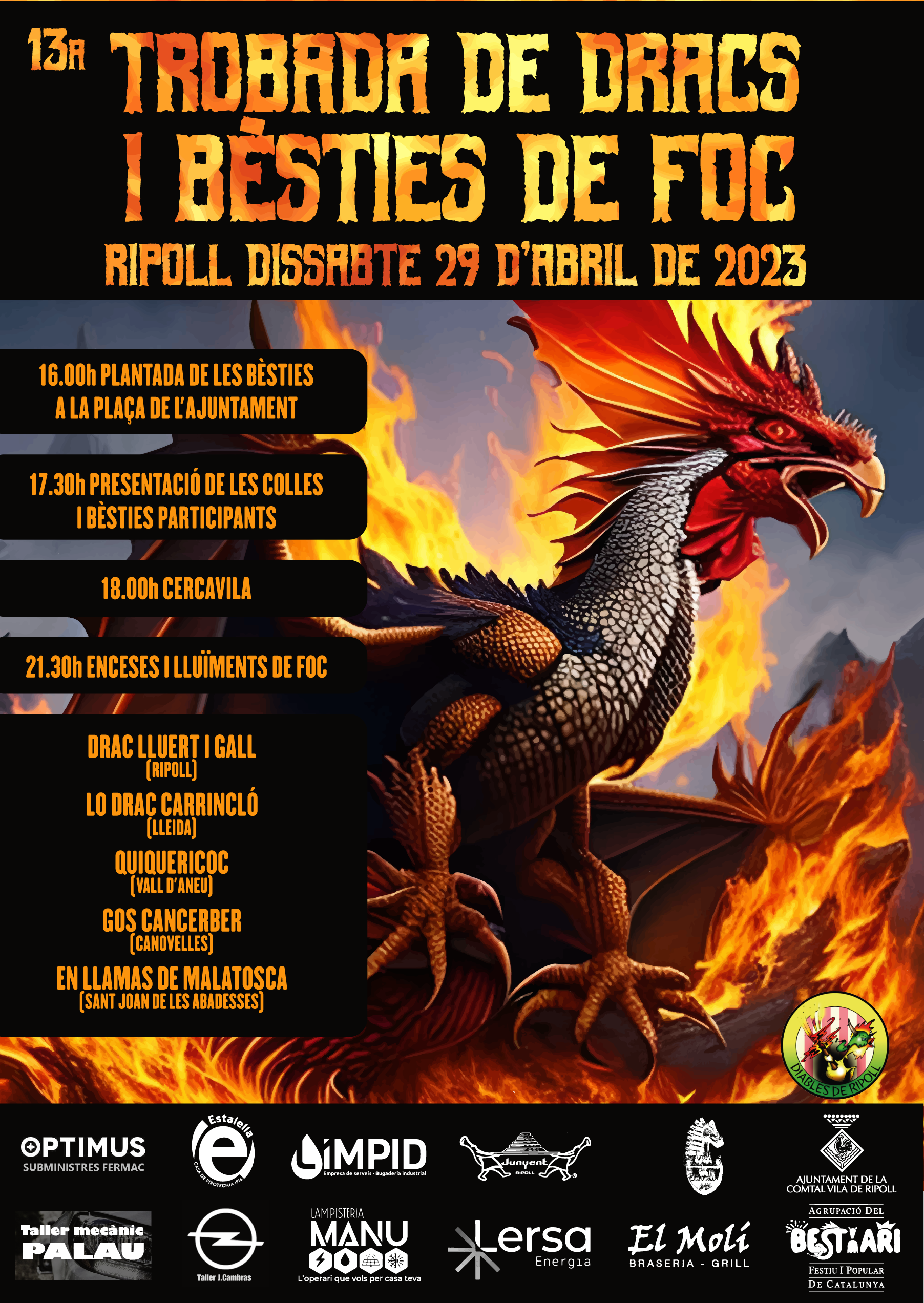 « All Esdeveniments Aquest event ja ha passat. 13a Trobada de Dracs i Bèsties de Foc (Ripoll) 29 d'abril de 2023 16:00 a 23:00 Navegació d'Esdeveniment « 35è Aniversari del Drac de Sant Jaume dels Domenys Sant Cugat del Vallès torna a invocar al Boc de Can Vernet i celebra l’Encabronada 2023. » + Google Calendar+ Exportar iCal Detalls Data: 29 d'abril de 2023 Hora: 16:00 a 23:00 Esdeveniment Categories: Activitats associats, Girona-Catalunya Nord i L'Hérault Organitzador Diables de Ripoll Recinte Ripoll