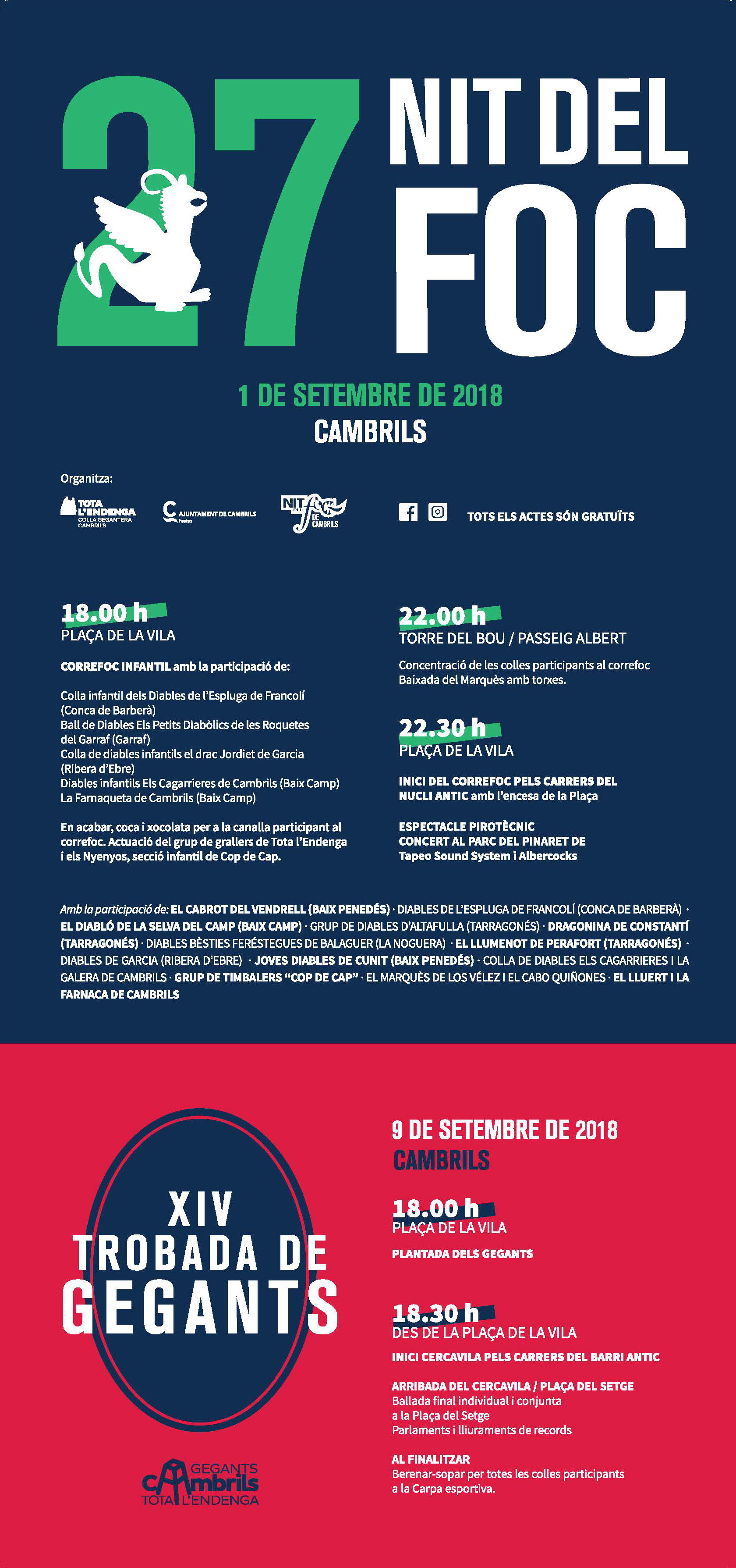 « All Esdeveniments Aquest event ja ha passat. 27a Nit del Foc de Cambrils 1 de setembre de 2018 Navegació d'Esdeveniment « XXXV Correfoc de les Terres de l’Ebre i VIII Concurs d’Enceses Ciutat de Tortosa IV Trobada de Bèsties de Foc » Programa d’actes: Programa2018 + Google Calendar+ Exportar iCal Detalls Data: 1 de setembre de 2018 Esdeveniment Categories: Activitats associats, El Camp-Conca-Priorat Organitzador Colla Gegantera Tota l’Endenga de Cambrils Correu electrònic: totalendenga@totalendenga.org Web: http://www.totalendenga.org Recinte Plaça de la Vila de Cambrils Plaça de la Vila Cambrils, Espanya + Mapa de Google