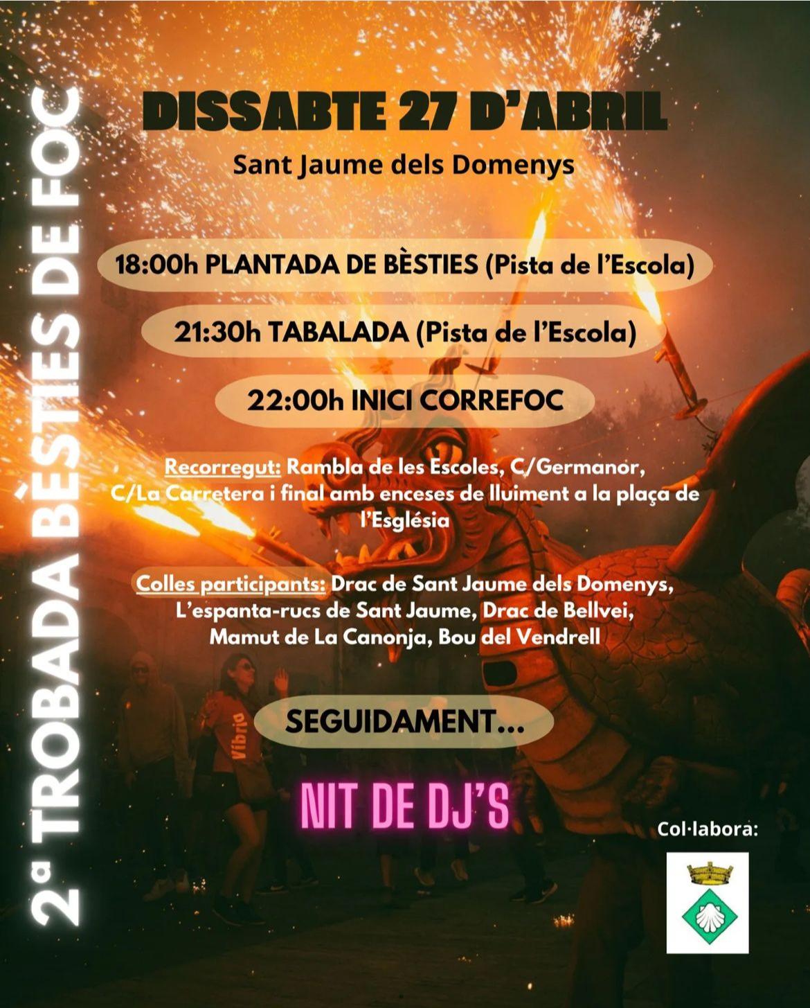 El pròxim dissabte 27 d’abril, a Sant Jaume dels Domenys se celebrarà la 2ª Trobada de Bèsties de Foc.