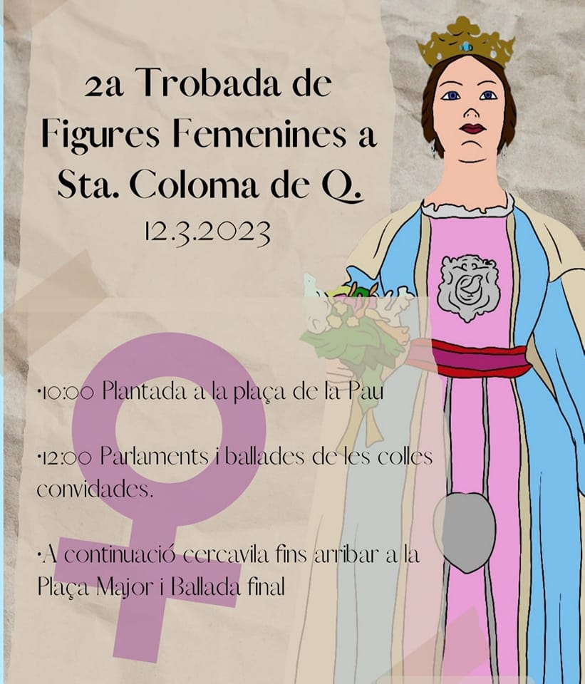 El pròxim diumenge 12 de març se celebrarà a Santa Coloma de Queralt (Conca de Barberà) la 2a Trobada de Figures Femenines. A les 10 del matí es farà una plantada de figures a la plaça de la Pau. A les 12 h tindran lloc els parlaments i les ballades de les colles convidades i, en acabar, començarà una cercavila fins arribar a la plaça Major, on es farà una ballada final.