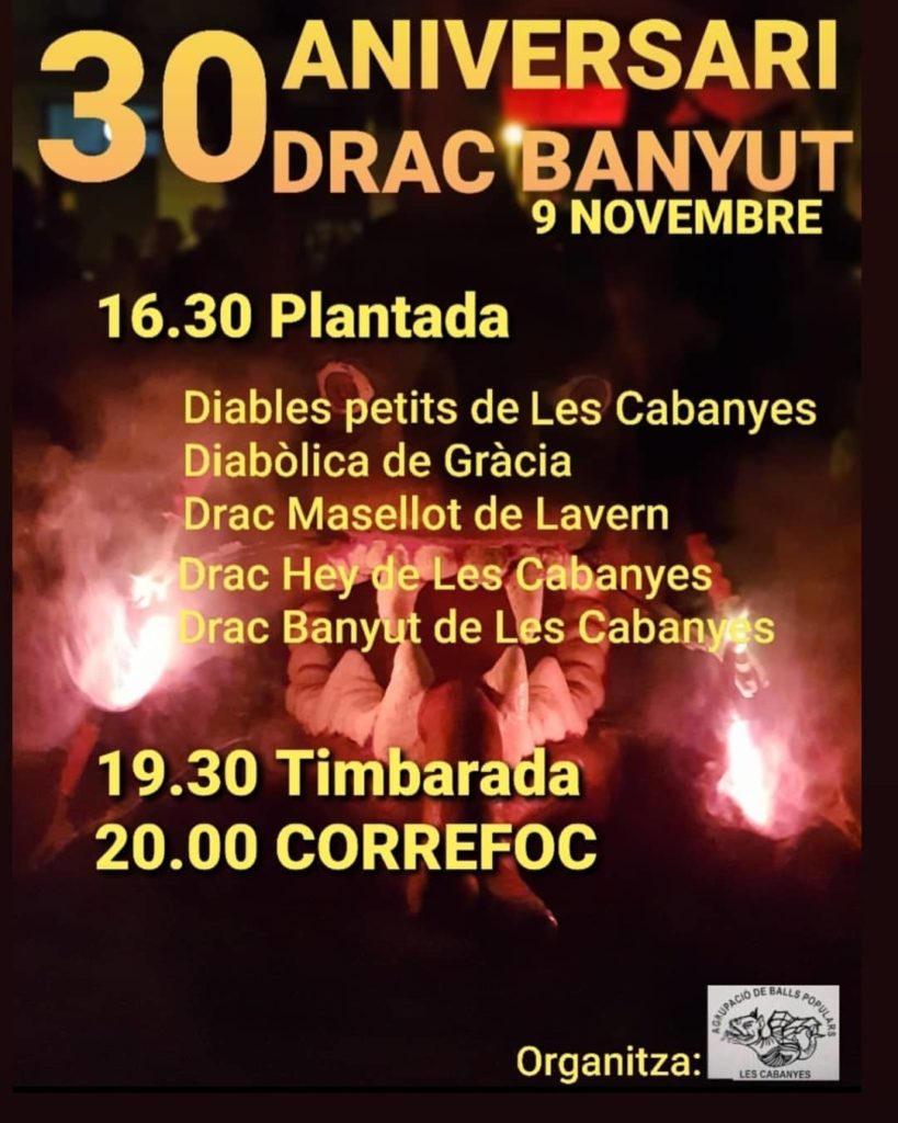 El Drac Banyut de les Cabanyes compleix 30 anys i, per celebrar-ho, l’Agrupació de Balls Populars del municipi ha organitzat una trobada de bèsties i diables. A les 16.30 h començarà l’acte amb la plantada de bèsties. A les 19.30 h es farà una timbalada i, més tard, a les 20 h, serà el torn del correfoc.