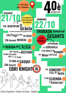 El pròxim 21 i 22 d’octubre, la Colla de Geganters i Grallers de Gràcia de Sabadell celebrem els actes de cloenda del seu 40è aniversari i la 27a Trobada Comarcal de Gegants del Vallès.