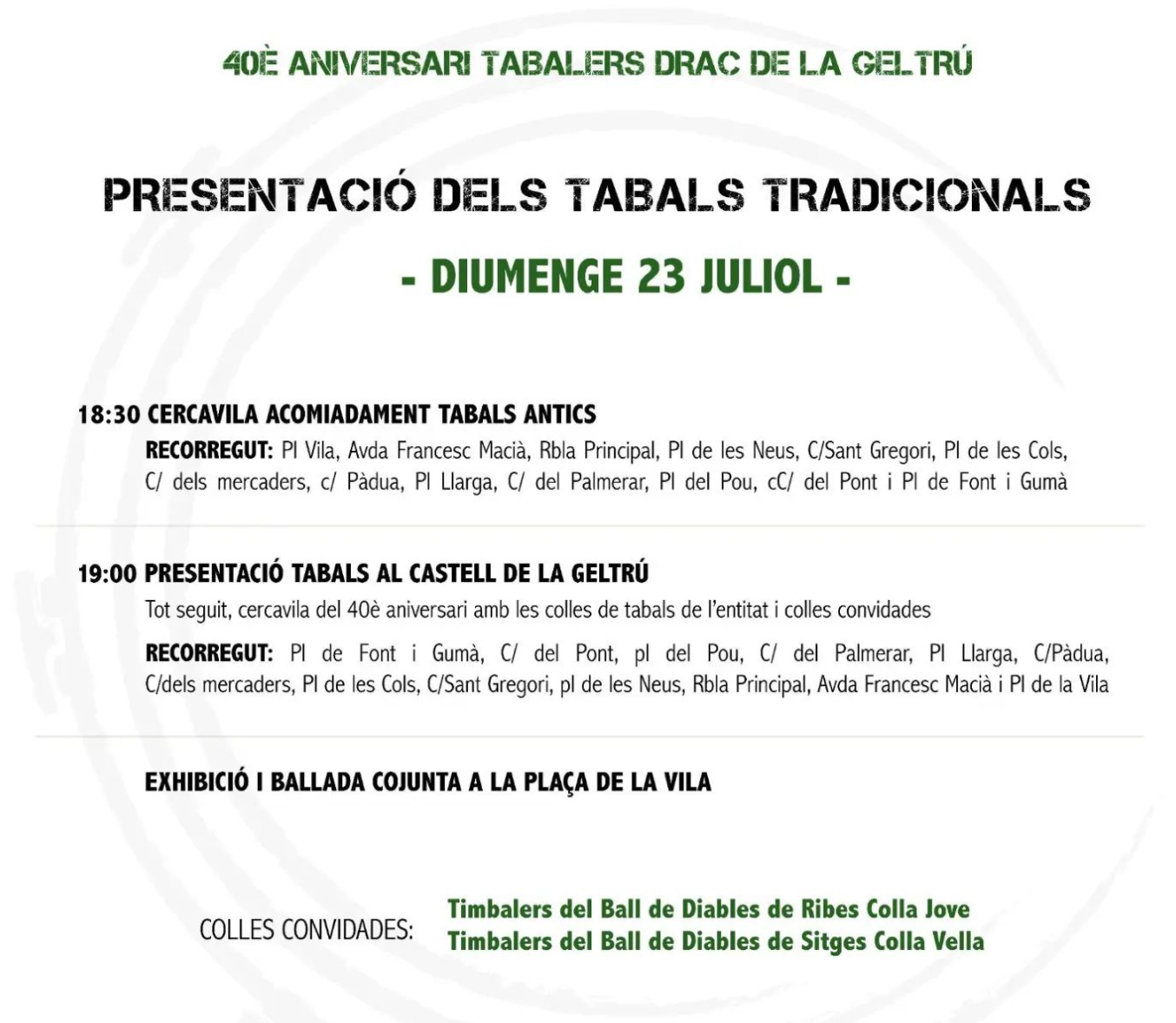 Aquest diumenge 23 se celebren els 40 anys dels tabalers del Drac de la Geltrú amb la renovació de tots els instruments de la colla del Drac gran. Tornen als orígens, i passen a tabal tradicional! Veniu a escoltar els nostres nous tabals de pell de @xixoluthier en el marc de la @fmvilanovailageltru.