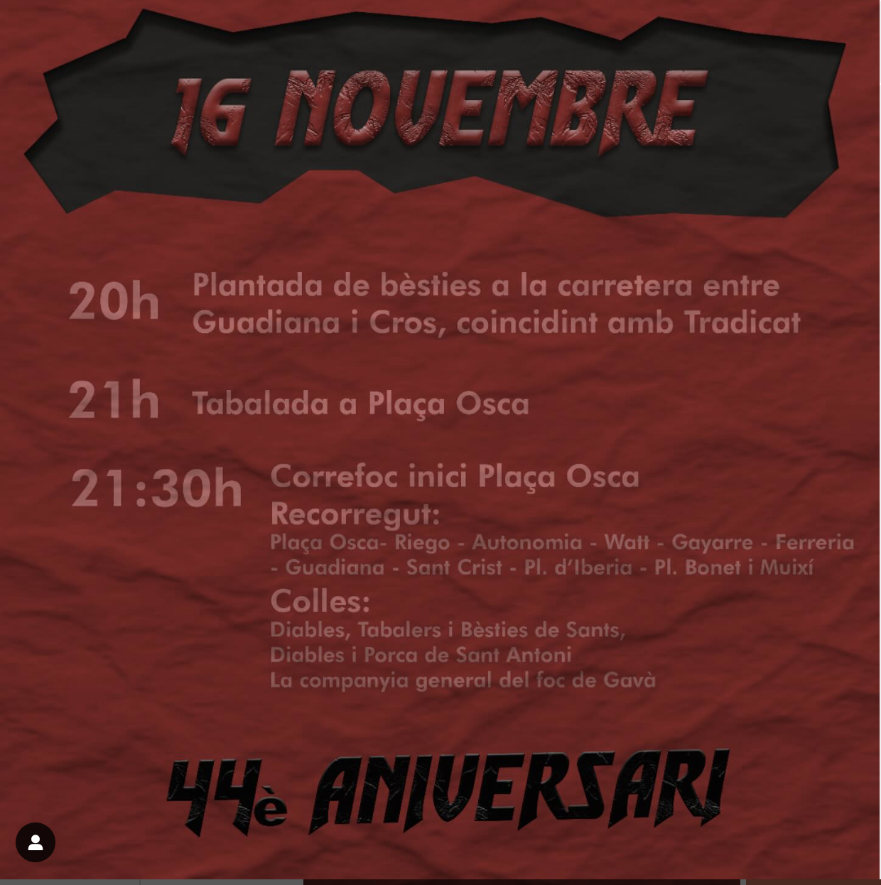 « All Esdeveniments Aquest event ja ha passat. 44è aniversari dels Diables i tabalers de Sants 16 de novembre de 2024 20:00 a 23:00 Navegació d'Esdeveniment « Trobada de dracs i bèsties de Sant Boi de Llobregat Trobada de Bèsties de Vilassar de mar » 44è ANIVERSARI DELS DIABLES DE SANTS Sants (Barcelona) Plaça Osca ️ Dissabte 16 de novembre ️ 20 h, Plantada 21 h, Tabalada 21.30 h, Correfoc @diablestabalersibestiesdesants @diablesdesantantoni @ciafocgava + Google Calendar+ Exportar iCal Detalls Data: 16 de novembre de 2024 Hora: 20:00 a 23:00 Esdeveniment Categories: Activitats associats, Barcelona Ciutat, Territorials Etiquetes de l'Esdeveniment:aniversari, barcelona, correfoc, Sants, tabalada