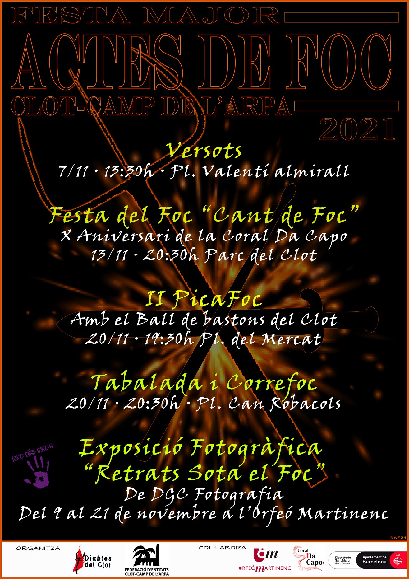 Amb motiu de la Festa Major del Clot- Camp de l’Arpa, aquest mes de novembre es faran diferents actes de foc. És el cas d’una Tabalada i Correfoc el 20 de novembre a les 20.30 h a la plaça de Can Robacols.