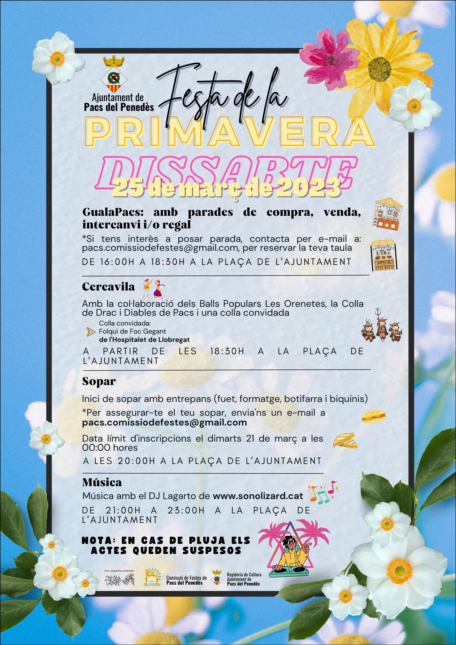 Els Balls Populars Les Orenetes, la Colla del Drac i Diables de Pacs més una colla convidada (el Folqui de Foc de l’Hospitalet de Llobregat) participaran el pròxim dissabte 25 de març en la Festa de la Primavera del municipi. A les 18.30 h, des de la plaça de l’Ajuntament, començarà una cercavila que recorrerà els carrers més cèntrics del poble.