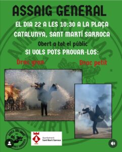 El proper 22 de març a les 10.30h del matí, a la Pl. Catalunya (Sant Martí Sarroca), els dracs tornen a sortir al carrer en un nou assaig general a porta oberta a tot el públic, on tothom que vulgui podrà provar les figures!