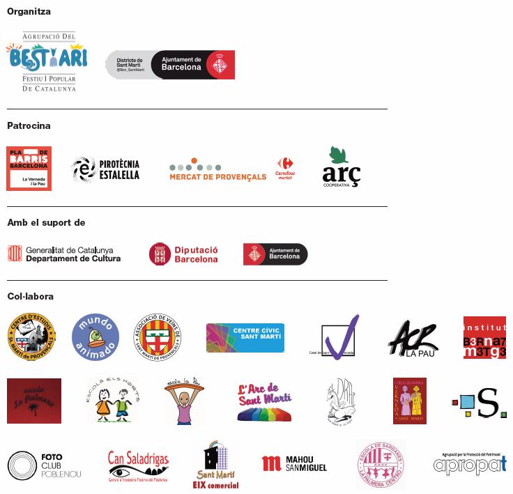 A càrrec de: tabalades, Espiadimonis de Sant Martí, Drac Trajana, Escola Sardanista la Palmera, Cuca de l’escola Els Horts