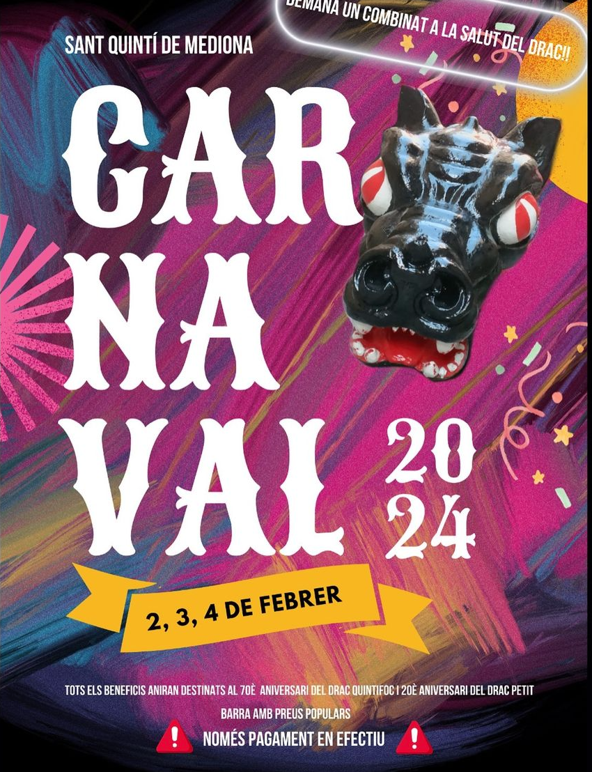 Els dies 2, 3 i 4 de febrer de 2024, Sant Quintí de Mediona celebra el carnaval. El Drac Quintifoc ha preparat i participarà d’algunes de les activitats. Consulteu el programa de Carnaval de Sant Quintí de Mediona aquí