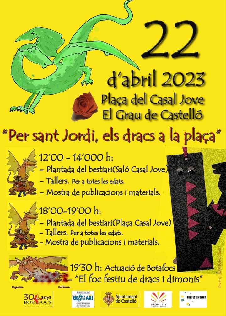 Sota el nom “Per Sant Jordi, els dracs a la plaça”, diumenge 22 d’abril es faran diferents actes a la plaça del Casal Jove del barri del Grau com una plantada de bestiari, tallers per a totes les edats i mostra de publicacions i materials. A dos quarts de vuit de la tarda, a més, tindrà lloc una mostra de foc titulada “El foc festiu de dracs i dimonis”.