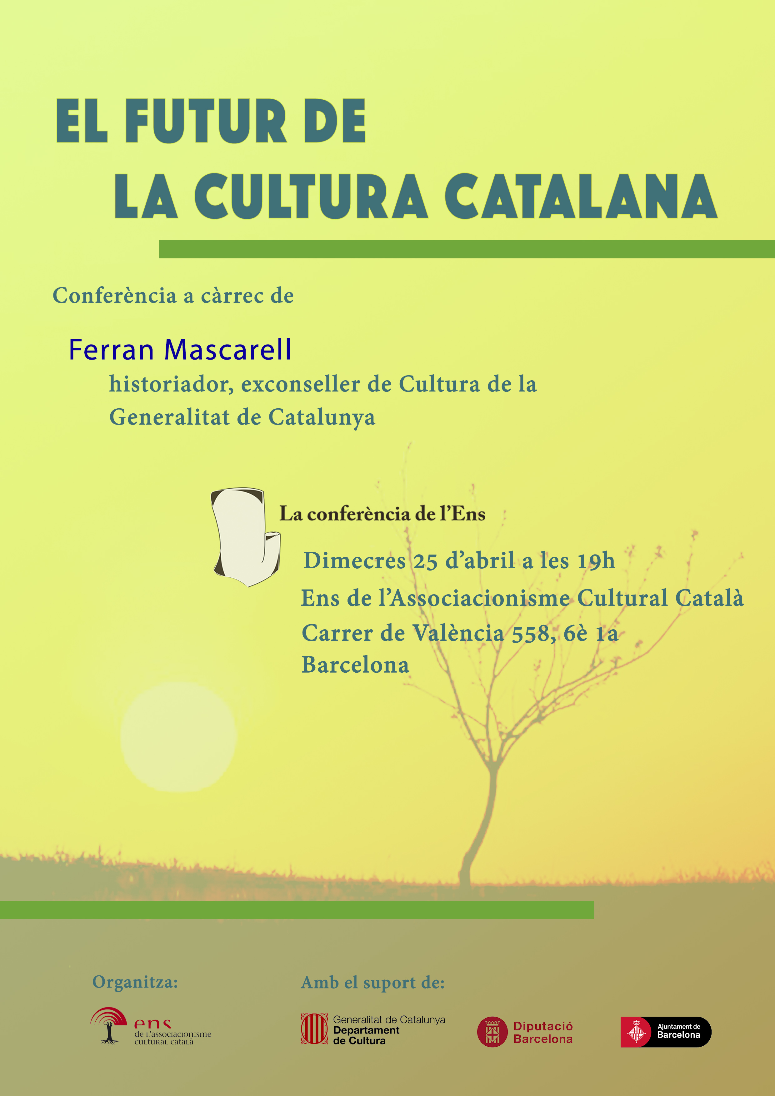 Us volem convidar a la conferència “El futur de la cultura catalana“, a càrrec de l’exconseller de Cultura Ferran Mascarell, que tindrà lloc el dimecres 25 d’abril (19:00h) a la seu de l’Ens de l’Associacionisme Cultural Català (Carrer València, 558, 6è 1a, Barcelona). Més info: https://bit.ly/2IO2AUu