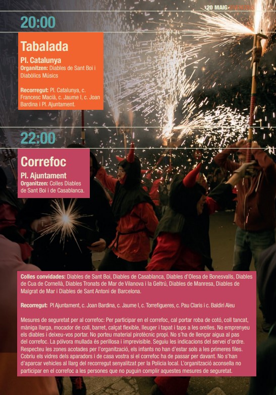 En el marc de la Festa Major de Sant Boi de Llobregat, divendres 20 de maig es farà un correfoc que començarà a les 22 h des de la plaça de l’Ajuntament. Les colles participants seran: Diables de Sant Boi, Diables de Casablanca, Diables d’Olesa de Bonesvalls, Diables de Cua de Cornellà, Diables Tronats de Mar de Vilanova i la Geltrú, Diables de Manresa, Diables de Malgrat de Mar i Diables de Sant Antoni de Barcelona.