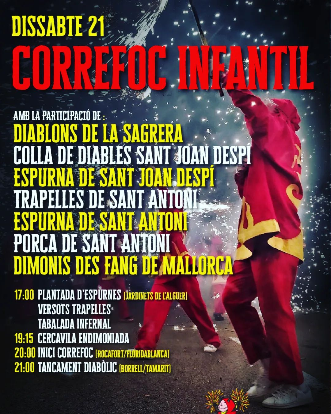 La Porca i l’Espurna de Sant Antoni i l’Espurna de Sant Joan Despí sortiran a llençar foc acompanyades pels Diablons de la Sagrera, la colla de Diables de Sant Joan Despí, els Diables Trapelles de Sant Antoni i els Dimonis des Fang de Mallorca.
