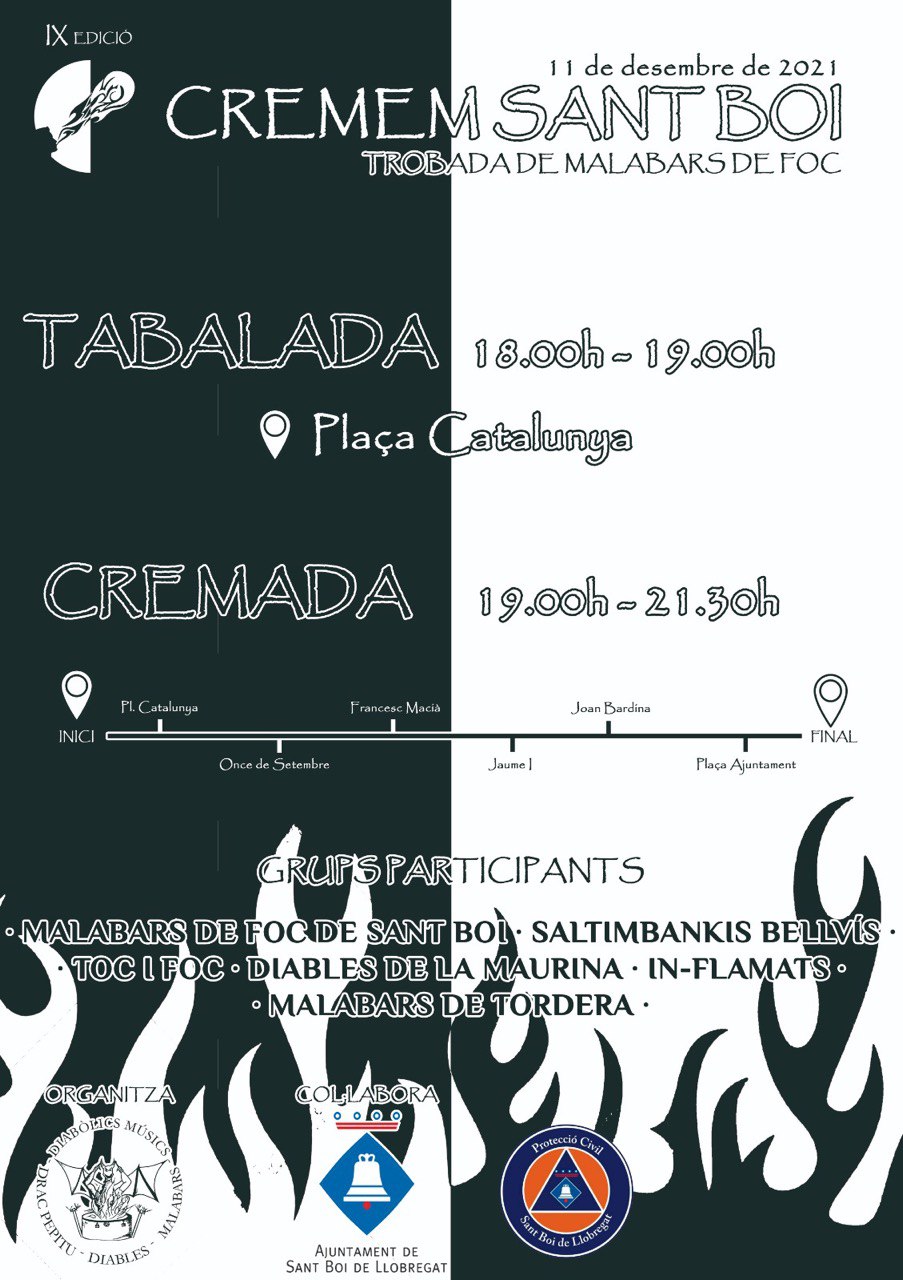 El Grup de Foc de Sant Boi ha organitzat per aquest dissabte 11 de desembre la IX edició de la Trobada de Malabars de Foc “Cremem Sant Boi”, que se celebrarà amb una tabalada i una cremada.