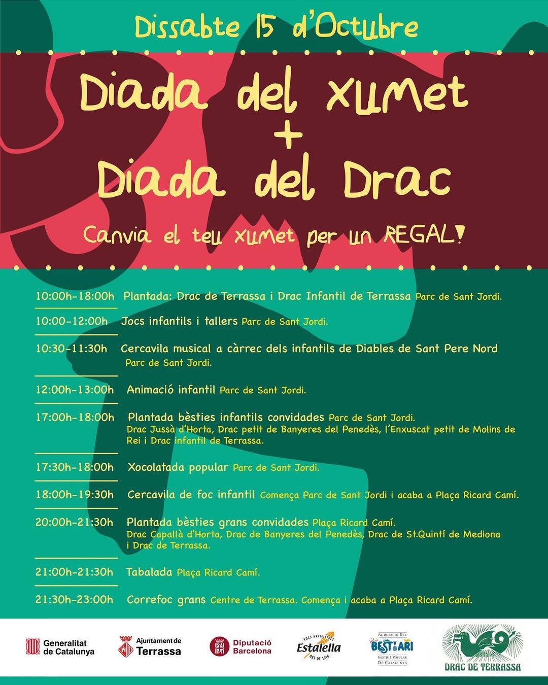 Després d’haver-se hagut d’ajornar per les tempestes torrencials del cap de setmana del 24 de setembre, aquest dissabte 15 d’octubre se celebrarà la Diada del Xumet i la Diada del Drac de Terrassa.