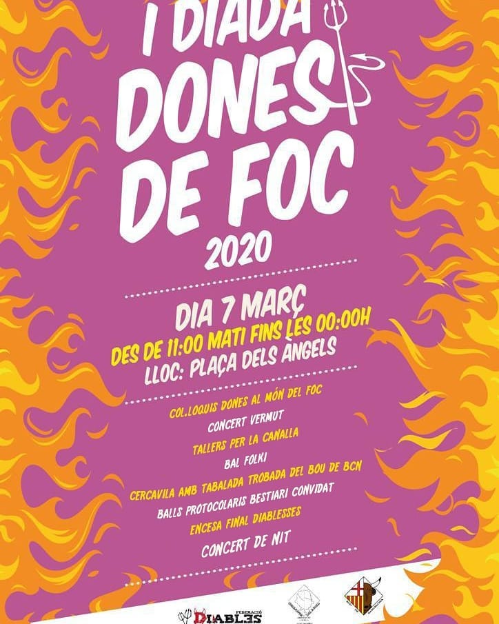 El pròxim dissabte 7 de març tindrà lloc la primera Diada de Dones de Foc. Enguany, amb motiu de la celebració del dia de la dona, la Federació de diables de la ciutat de Barcelona, la colla Amics Gegants Ramon i Lola del Raval i el Bou de Barcelona han acordat fer la celebració de forma conjunta, amb el propòsit de fer més visible el paper de la dona dins de la cultura popular barcelonina. La diada anirà destinada a la participació i difusió del seu paper, dins del marc d’activitats que han coorganitzat. El dia començarà amb xerrades col·loqui i seguirà amb tallers infantils i un concert vermut. A la tarda es farà la trobada del Bou de barcelona i el dia acabarà amb concerts feministes. L’acte també compta amb la col·laboració de l’Ajuntament de Barcelona.